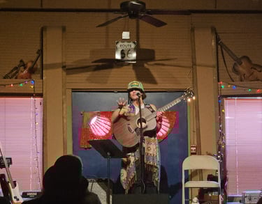 She’s a fingerpicker, lyricist, and vocal samplist. A mix that reflects her winding musical journey from Oklahoma to Africa to Japan and back again. While her roots trace to folk and Americana, her years in Tokyo added an unexpected pulse to her sound. Now back home in Oklahoma City with her husband, two kids, and three dogs, she’s building a bridge between tradition and playfulness, carrying both grit and grace in her music.