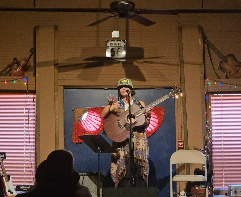 Lindsey Flowers crafts her thoughts into folk anthems that make fun of the human condition. With a bright yet raspy voice and fingerpicked guitar, she bridges folk realism, Tokyo-inspired rhythm, and a storyteller’s heart. From barefoot songs beneath string lights to laughter shared between strangers, her performances radiate humor and humanity. After two decades of writing in private, she made her debut at 40 at The Blue Door’s Women of WoodyFest showcase. Now based in Oklahoma City, she’s preparing her first EP filled with timeless folk storytelling with a wink and a pulse.